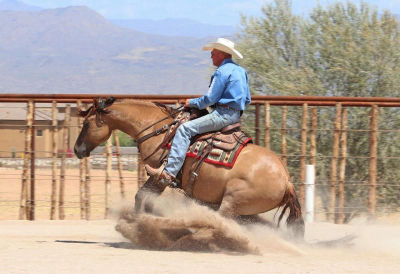 Always gentle, honest and easy going even with time off. Saddle him up and go enjoy! Peach easily performs all the reining maneuvers with long sliding stops, snappy spins and easy lead changes. He would be fun to show in the Ranch Riding and Versatility events. He has a super smooth jog and rocking chair lope. He has been ridden all over our Arizona ranch as well as many miles in the Texas.